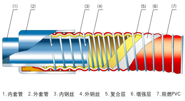 由于復(fù)合軟管自身結(jié)構(gòu)(見圖)為多層復(fù)合結(jié)構(gòu),在輸送介質(zhì)的過程中不會因為壓力的驟然增加或壓力超過正常工作范圍,因自身結(jié)構(gòu)特點不會瞬間爆破,僅使管體產(chǎn)生蠕動現(xiàn)象,最大工作壓力4.0Mpa,負壓可達0.1Mpa.